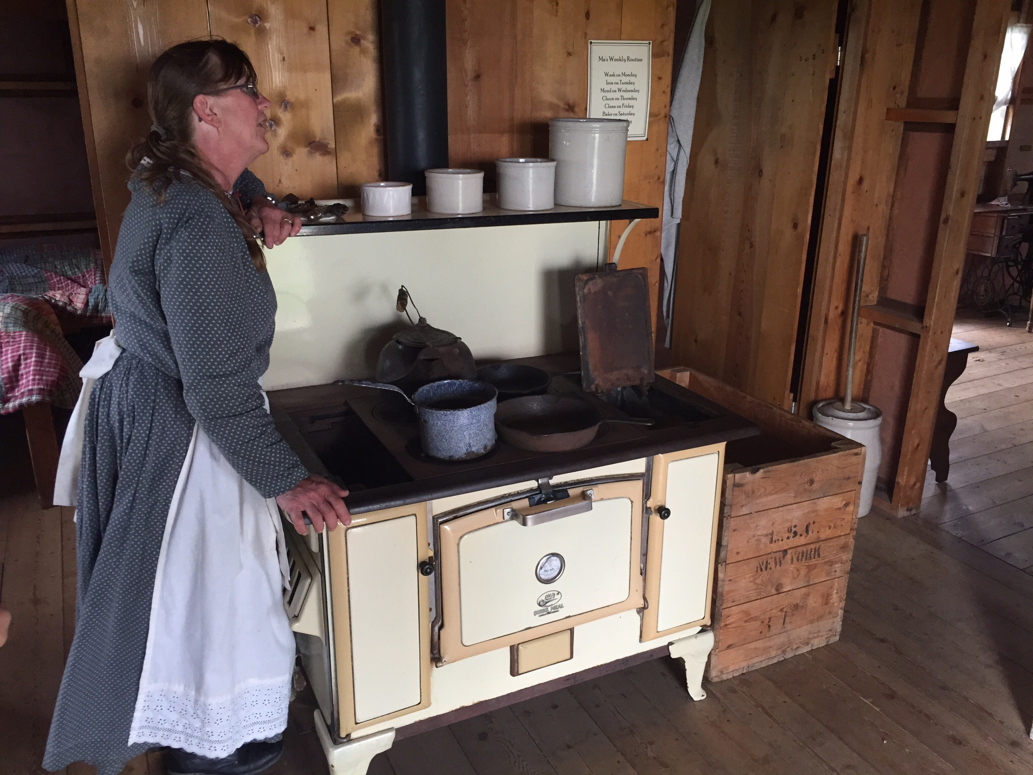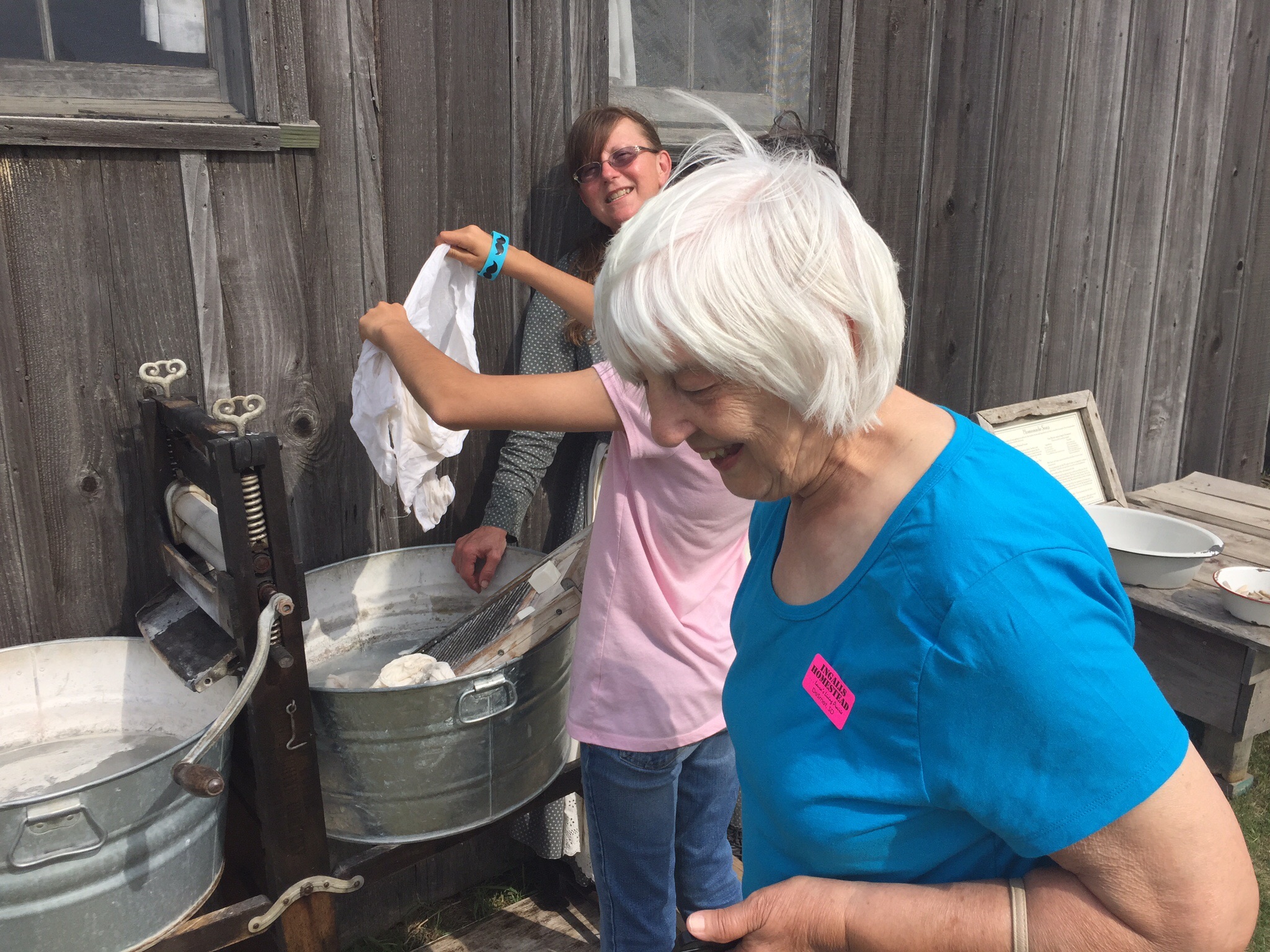 Outside the shanty, my daughter helped wash some clothes on a washboard, using homemade soap the docent made, and an even older wringer than I used. She then hung the clothes on the line. This also brought back not-so-fond memories of below zero weather and still needing to hang the clothes up to freeze dry. Don’t miss those days at all!