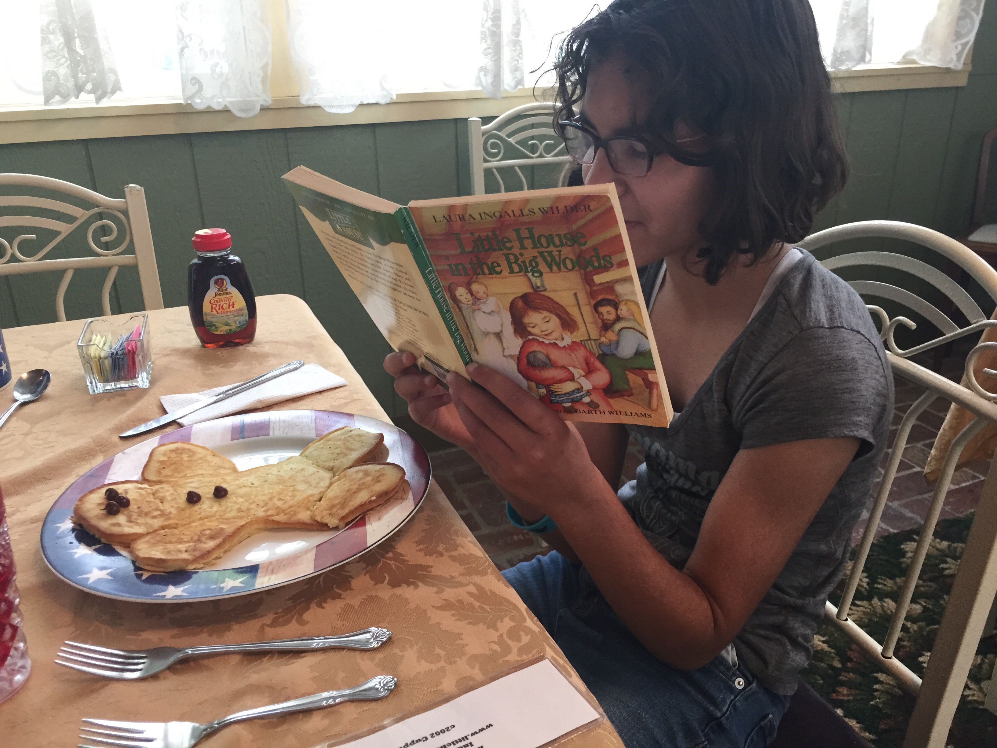 My daughter had ordered Ma’s Pancakes for breakfast. These were shaped into a bear as described in the Little House books. The owners brought a copy of the book with descriptive passage for Emily to read before eating the pancakes. It was a unique moment; one we won’t soon forget.