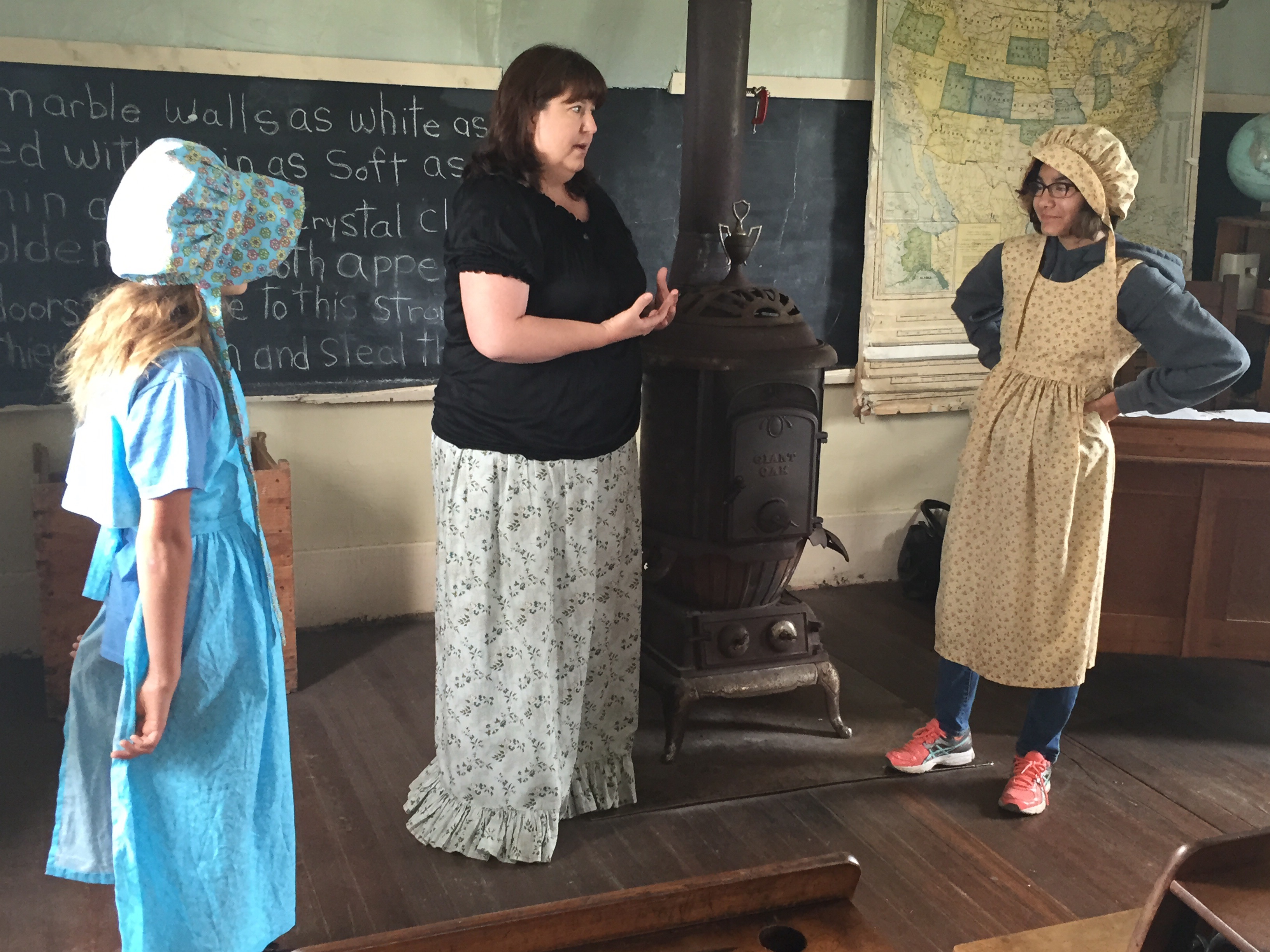 At the school, there were dresses and bonnets for the girls to get dressed up. Emily, very reluctantly, and I mean very, finally acquiesed and got into costume. Of course, grandma and I had to take a picture to perserve the moment. A local teacher was our docent, describing what school was like in the 1800’s and the chores students were expected to do for the school. Another little girl and Emily got to have an old-fashioned spelling bee (Emily won!).