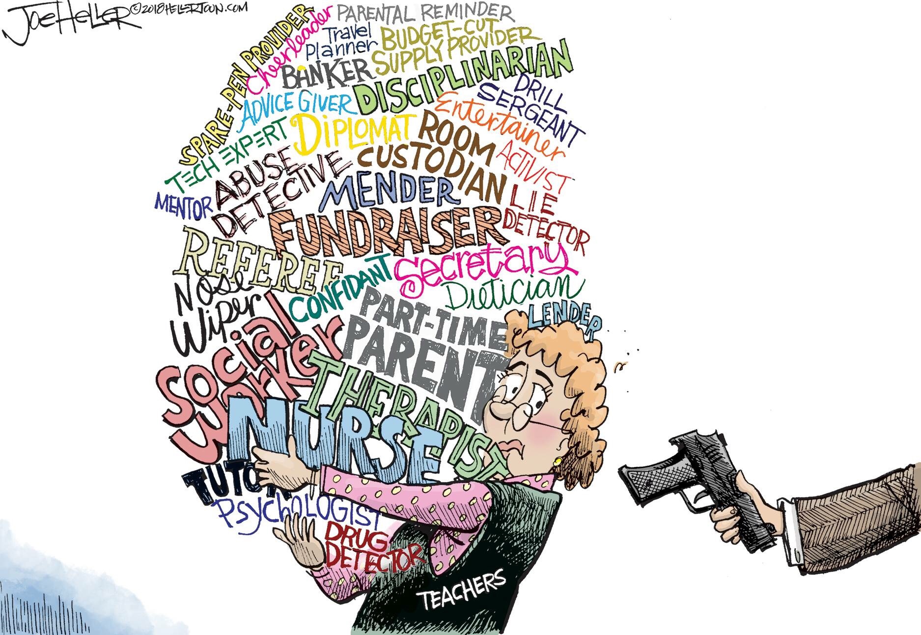 As you look at the following political cartoon and the short, and definitely not all encompassing, list of what educators are responsible to do essentially each and every day, think about that one teacher who helped you feel you mattered. Then, make sure to take a moment to thank that teacher if possible, or any teacher, even if you don’t have a child in school. Take a moment to reach out and let us know you appreciate the positive effect we have on society as the protectors of children.