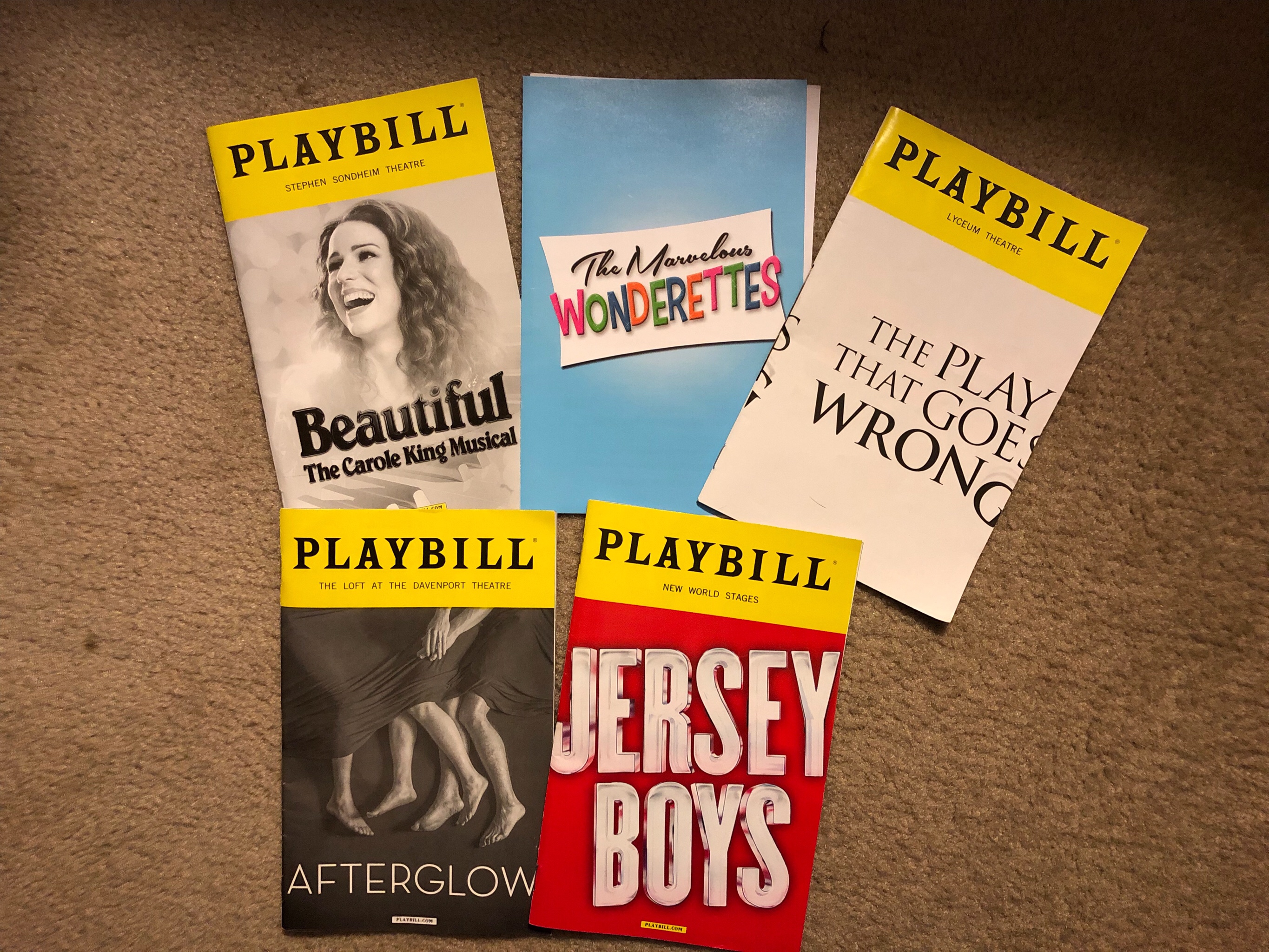 We were able, as a group, to see five performances this year. All of us went to see Afterglow,The Marvelous Wonderettes, Beautiful: The Carole King Story, and The Play That Went Wrong. Richard and I also went to see Jersey Boys. Every one of the performances were pretty good, but, if you can only see one performance when visiting New York, go see The Play That Went Wrong. You will be in stitches of laughter from start to finish for this one.