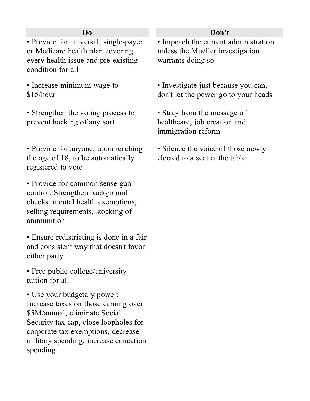 As you set your agenda for the next two years, here are the things I would like to see you propose and vote upon. Many things will not make it through the Senate to this administration due to Senator McConnell, who speaks about bipartisanship, but has not idea what it really looks like in action. Don’t let that stop you from proposing, voting, and sending to the Senate. Let the Senate, and the Republican leadership take the blame for blocking any legislation; then bring this to the attention of the electorate in 2020.