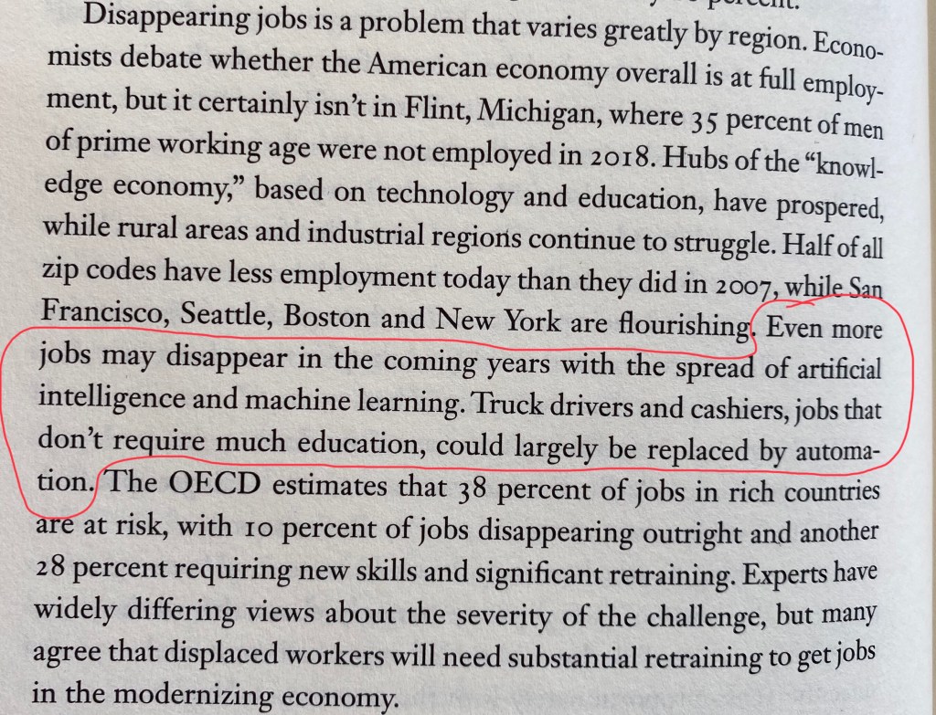 Andrew Yang’s book, The War on Normal People, talks extensively about how technology will eventually take the jobs of millions of Americans. The technology will make doing many things more convenient, which for the record,I love technology and see a place for it, but at what cost to employment?