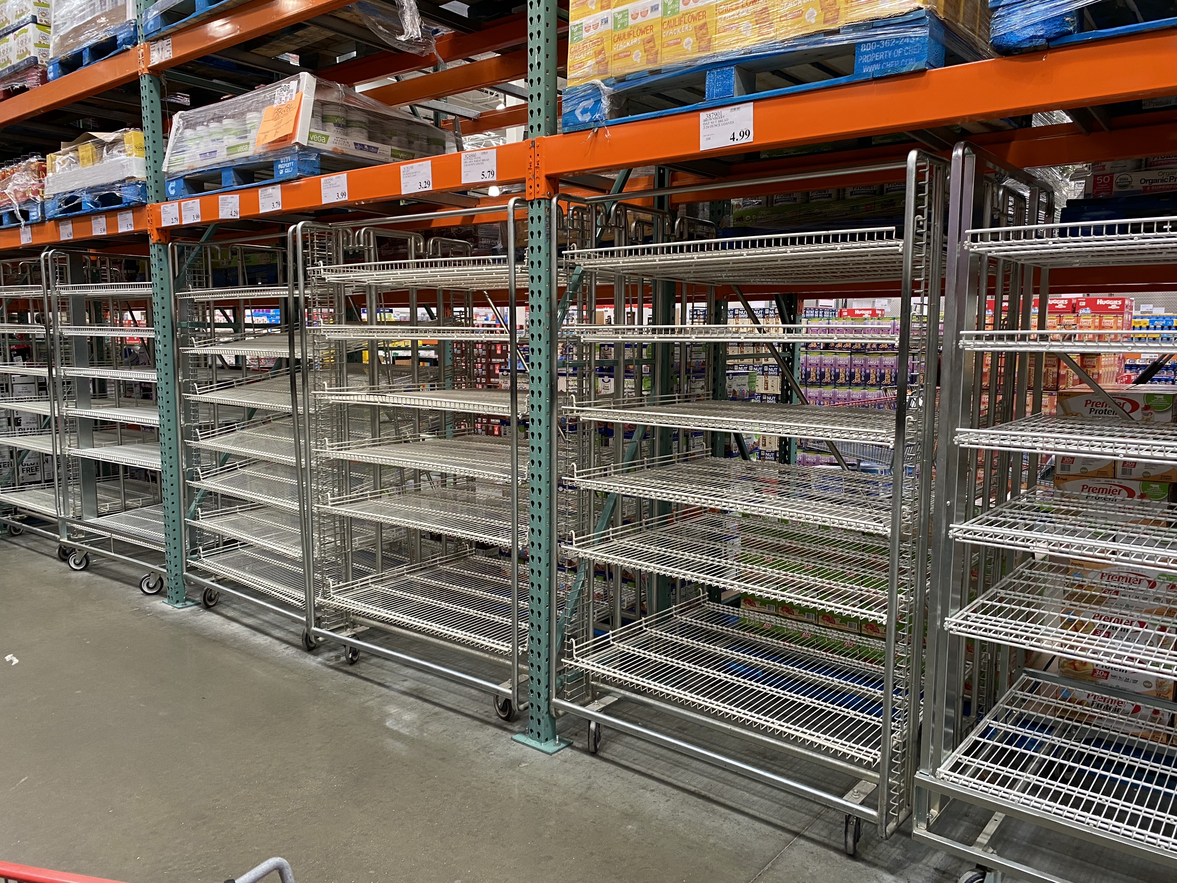 Next was the low supplies of food items. I’ve been going to Costco for years and never seen them down to just a few jars or boxes of so many food items. Even the ready-made meals were in short supply.
