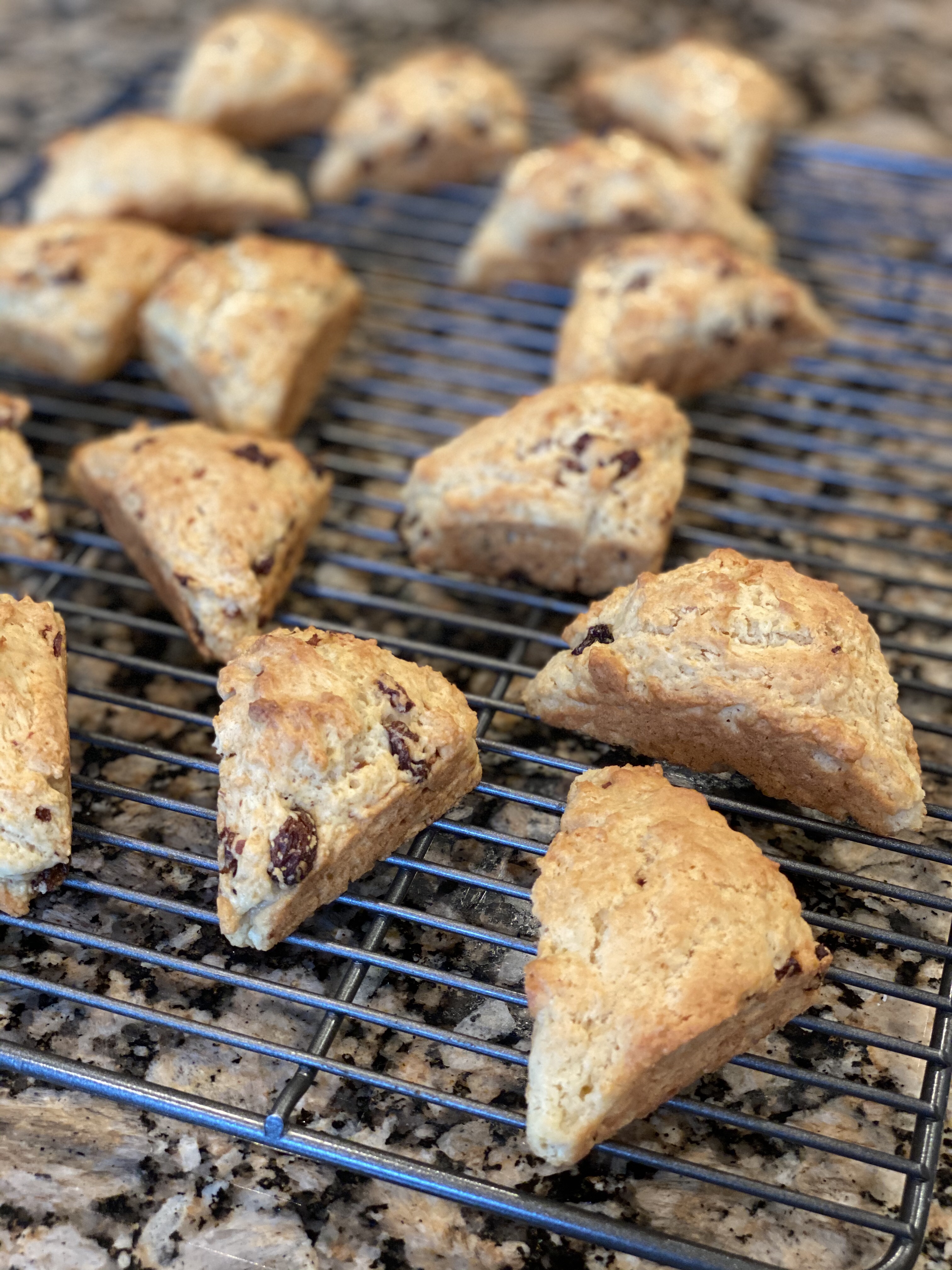 Then I had decided last night to make some scones today. After finding my scone cookbook (yes, I have a cookbook for just about anything), buttermilk with craisins jumped out at me. My scone pan is for 16 mini-scones. Thank goodness I weighed out the total dough and divided by 16. Otherwise I might not have had enough for each well. My visual estimating when it comes to spatial things just isn’t a strength.