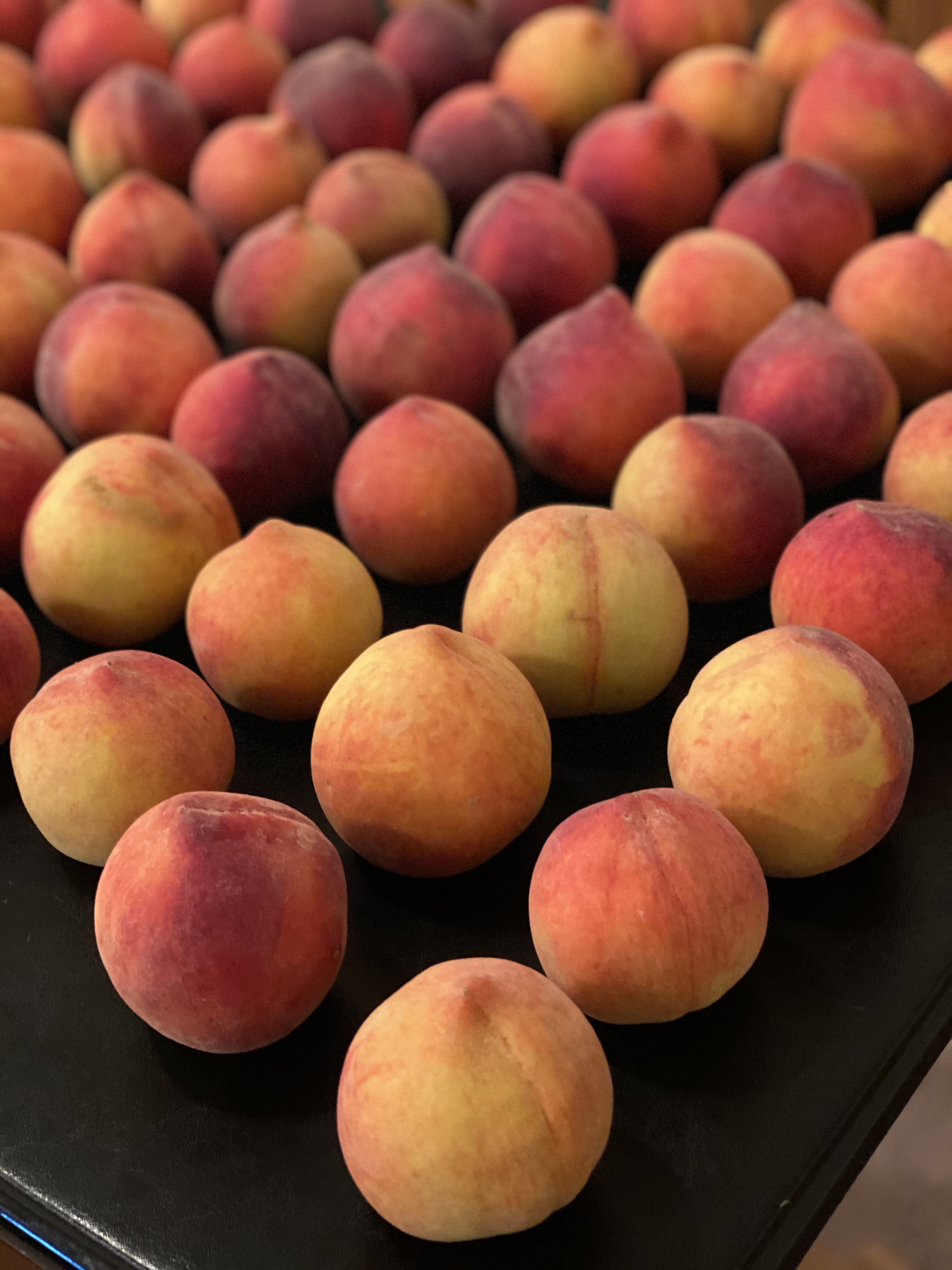 When I think about a half-bushel, I always think, “That’s not too many peaches!” Then, when I have them out on a table, a half-bushel looks a little more daunting. Then, when I have to start peeling them, a half-bushel looks very daunting!