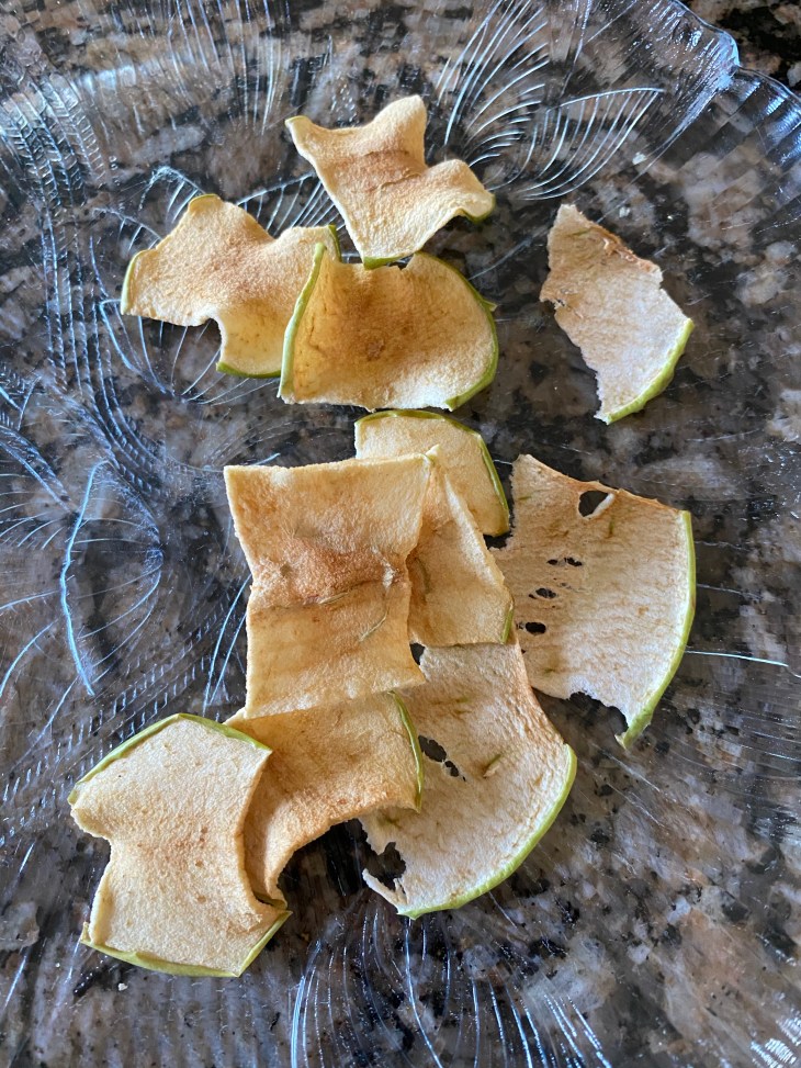 While the chips were baking, I decided to try the new air fryer’s dehydration setting. We had some apples left from last weekend, and a pear in the fruit bowl we keep on hand. Unfortunately, the apples had started to dry out (fresh don’t always last as long as store bought). As I went to throw the remaining apples away, I found one I had bought at the store, which was still in good shape. This one, along with one that seemed okay from the fresh batch, were sliced and ready to go in the air fryer. There was a pear in the bowl as well, which I also sliced to dehydrate.