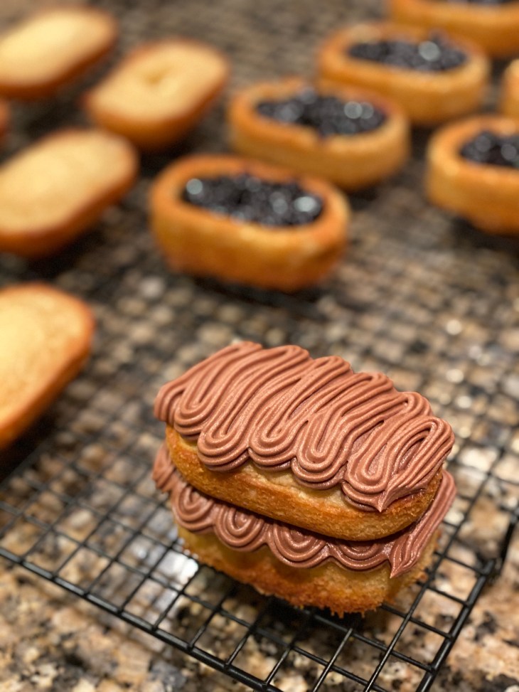 I was in a baking mood this evening and had to break the pans in. The batter was pound cake, the filling a blueberry compote, and a chocolate buttercream icing as part of the filling and the top icing. Feeling fancy, I even trotted out the pipping bag and a fancy tip.