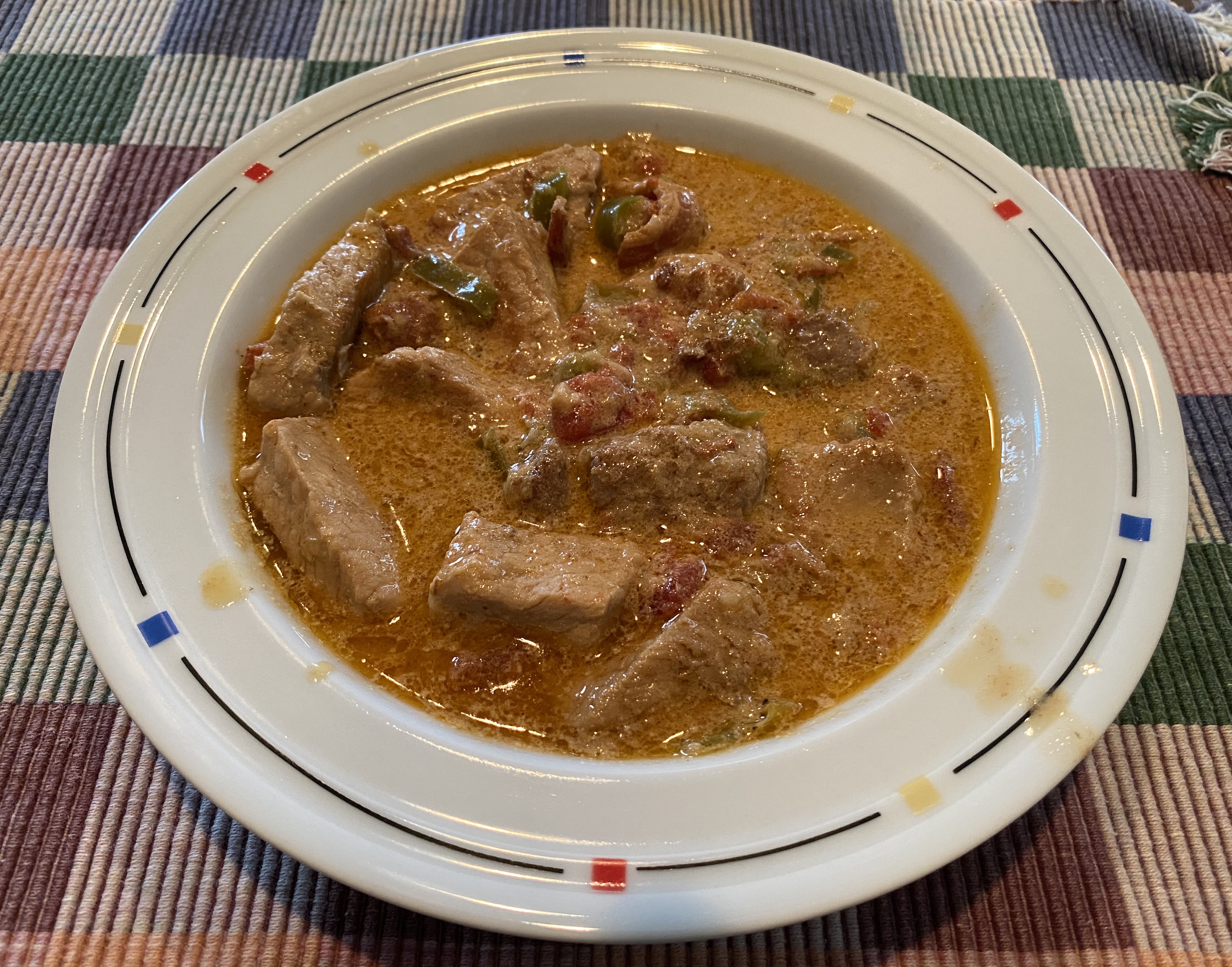 This evening it was csikós tokány (chee-kohsh to-kahny) for dinner from my new Hungarian cookbook. Basically it is pork stew with bacon, and it was very tasty. Was just the right thing for our cool breezy evening.