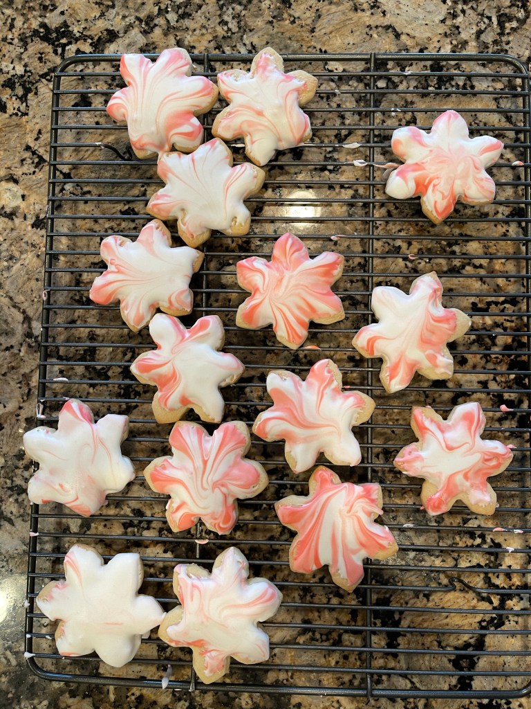 This morning I had to do some flow icing on the sugar cookies I made yesterday. It is fun to do, but boy does it take a while. Even with limiting the colors I used this time, it still took me several hours to mix the icing and decorate the cookies. Professional looking they aren’t, but for an amateur, I don’t think they look half-bad.