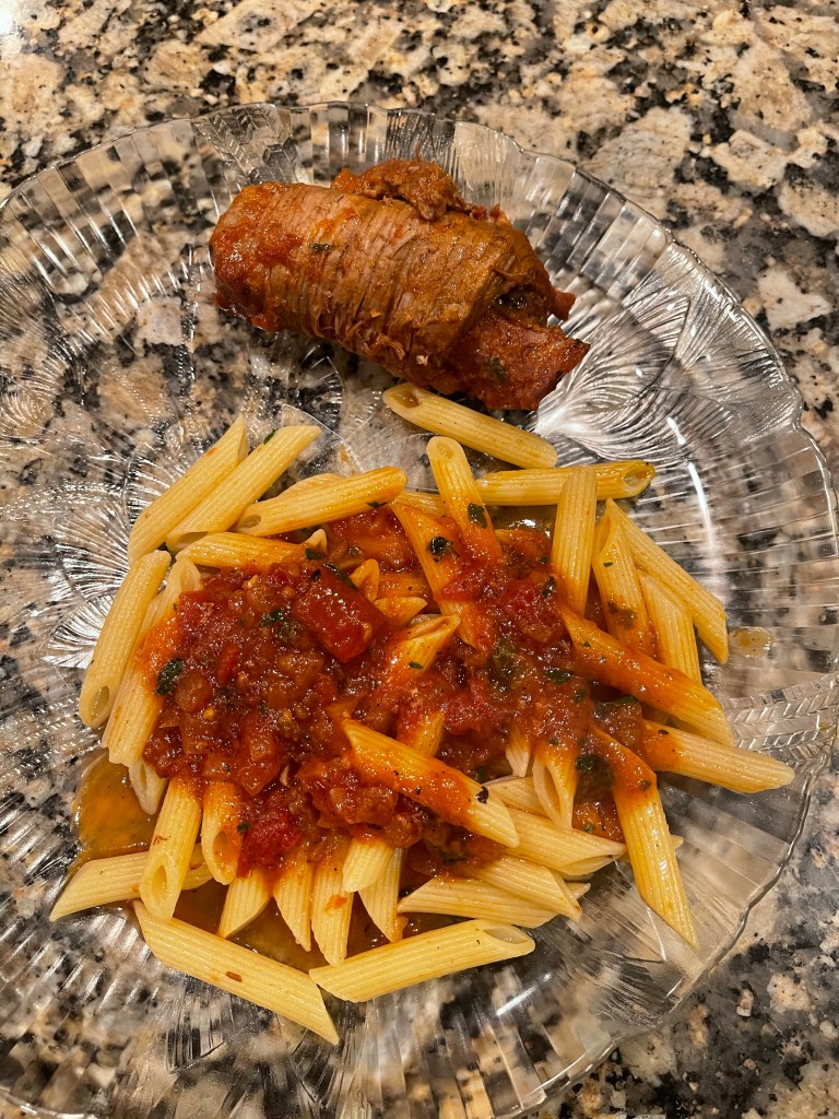 I started doing this routine about a month ago. Since then, we’ve had turnips in butter, chicken with mustard-cream sauce, Mexican chicken patties with roasted tomato sauce, parsnips and pears, apple cider pork, and the most difficult, but oh so delicious, hearty beef braciole with penne pasta.