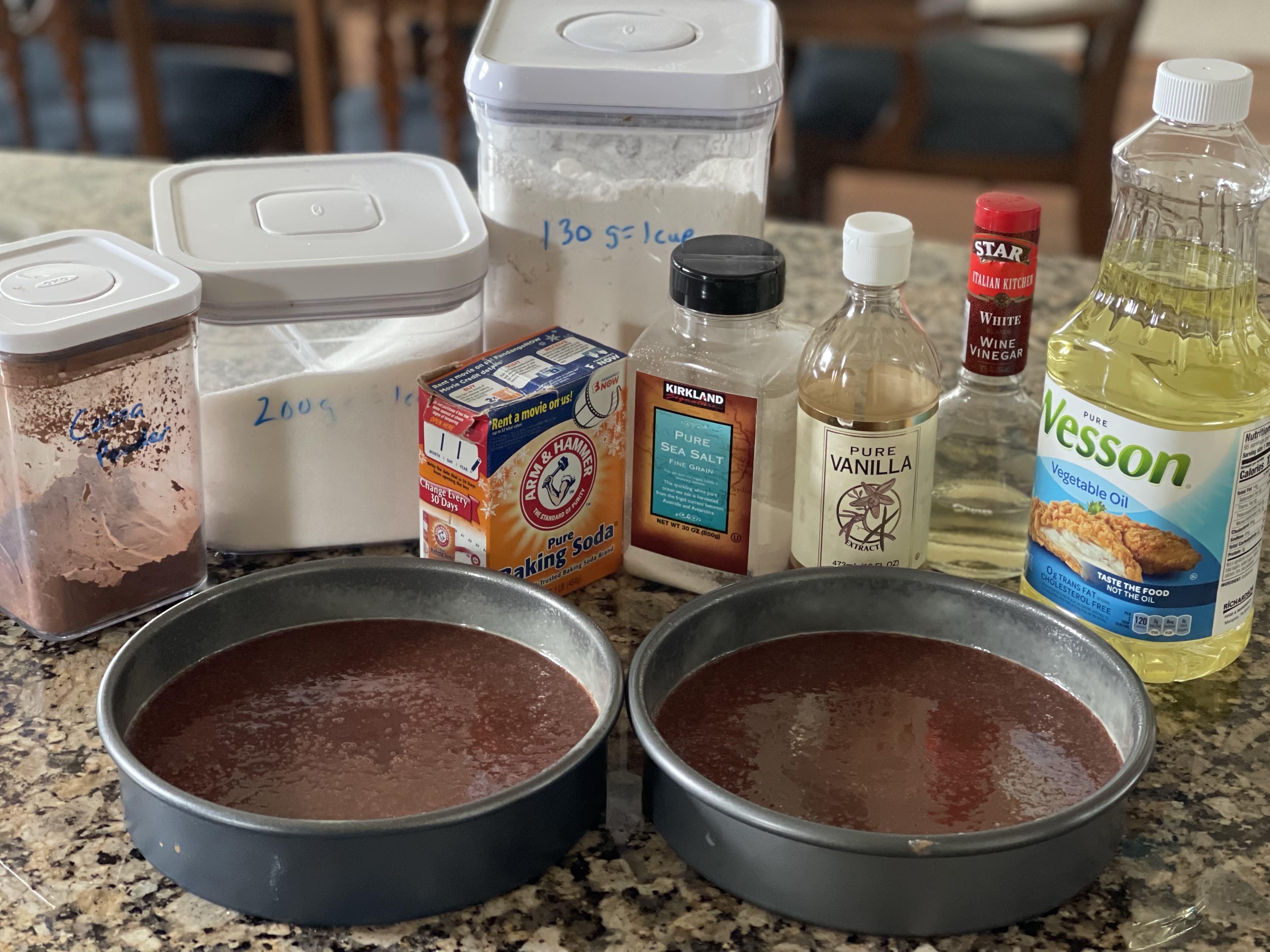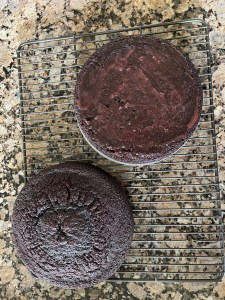 I gathered the ingredients using a King Arthur Flour chocolate cake recipe from one of their cookbooks. The recipe was for single layer, so I doubled it as I wanted two layers. There was also a recipe for chocolate ganache icing.