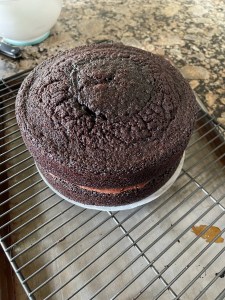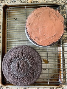 Using the King Arthur recipe for chocolate icing, I made a quick ganache. Since it was to run down the sides of the cake to coat. Unfortunately, since I hadn’t filled in the middle gap, the icing ran down the sides as expected, but “jumped over the middle part,” leaving the gap visible. Had I used the buttercream more prudently, the icing would have helped the ganache flow better and more evenly.