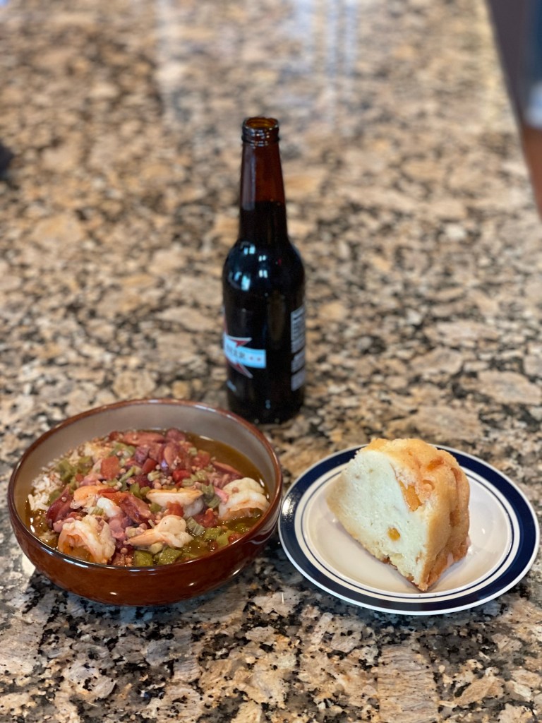 With him still at work, and my two children still living at home either asleep after working a double shift, or at band practice, it will be just me eating. After thinking about it though, it will actually be a nice little respite. In fact, I think I may just bring my bowl of stew, served over rice, followed by my peach pound cake, out onto the patio to eat there.