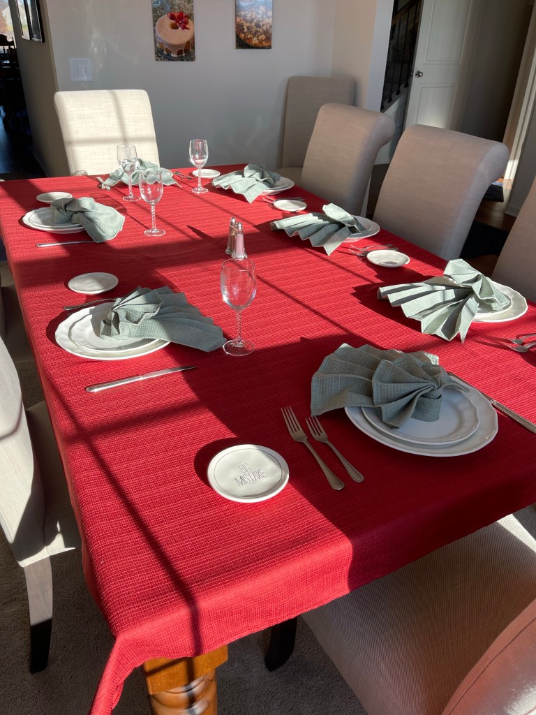 Here at the house, the new dinnerware has been washed and ready for food. The place settings are laid out. Napkin folding research has been completed with napkins ironed and on the table. Place setting names set by plates. Refrigerator cleared out. Recipes printed out and bookmarked. Plans in place for prep work tomorrow.