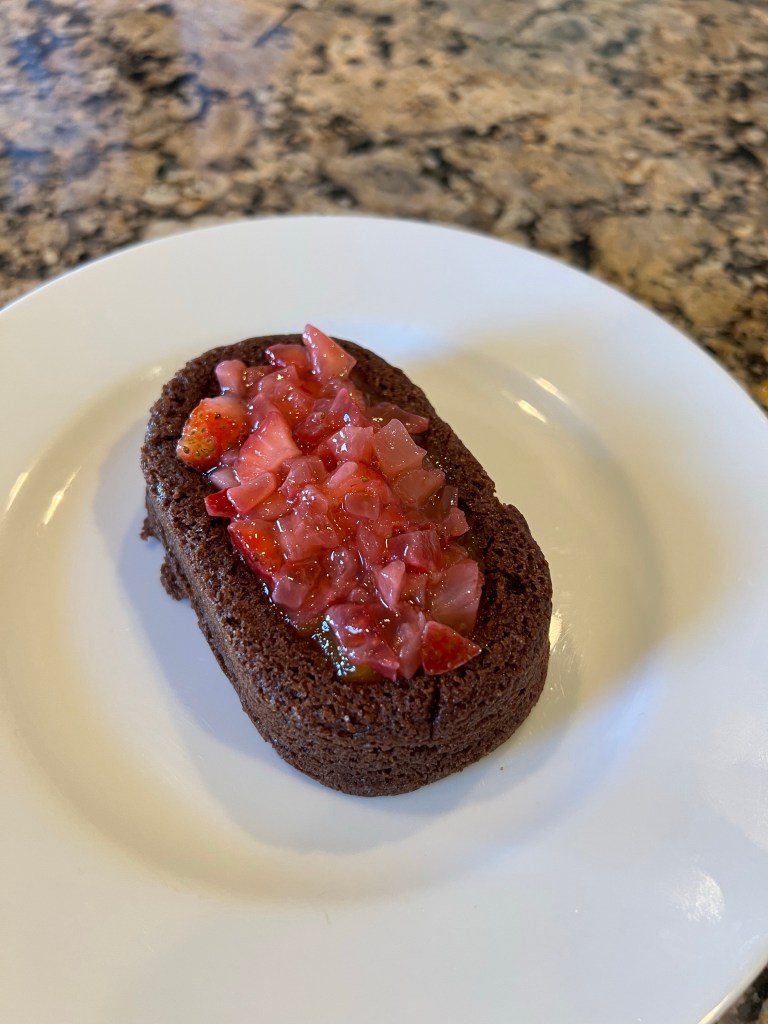 Once the brownies were fully cooked, I put together a sample for him to try. Portions were the next challenge. I wanted just a hint of mango with the chocolate in the brownie and strawberries being the stars. He took a bite and gave the thumbs up. I also took a bite and liked the profile. The only thing I changed was the amount of mango as its flavor was a little too subtle.