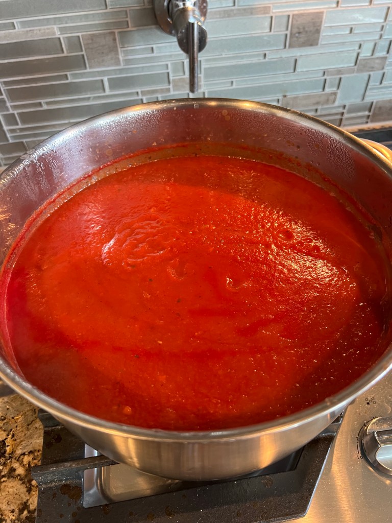 Green beans weren’t the only thing I worked on in terms of canning over the weekend. We have been out of pasta sauce for a little while. Since I was going to be in the kitchen anyway, and the sauce takes a long while to simmer and reduce, I put that on before starting on the green beans. The house always smells so good as the sauce cooks, which takes about three hours. When all was said and done, we now have seven quarts of base sauce to use. Pasta dinner, or homemade pizza (I use the same sauce for pizza), will be on the menu soon.
