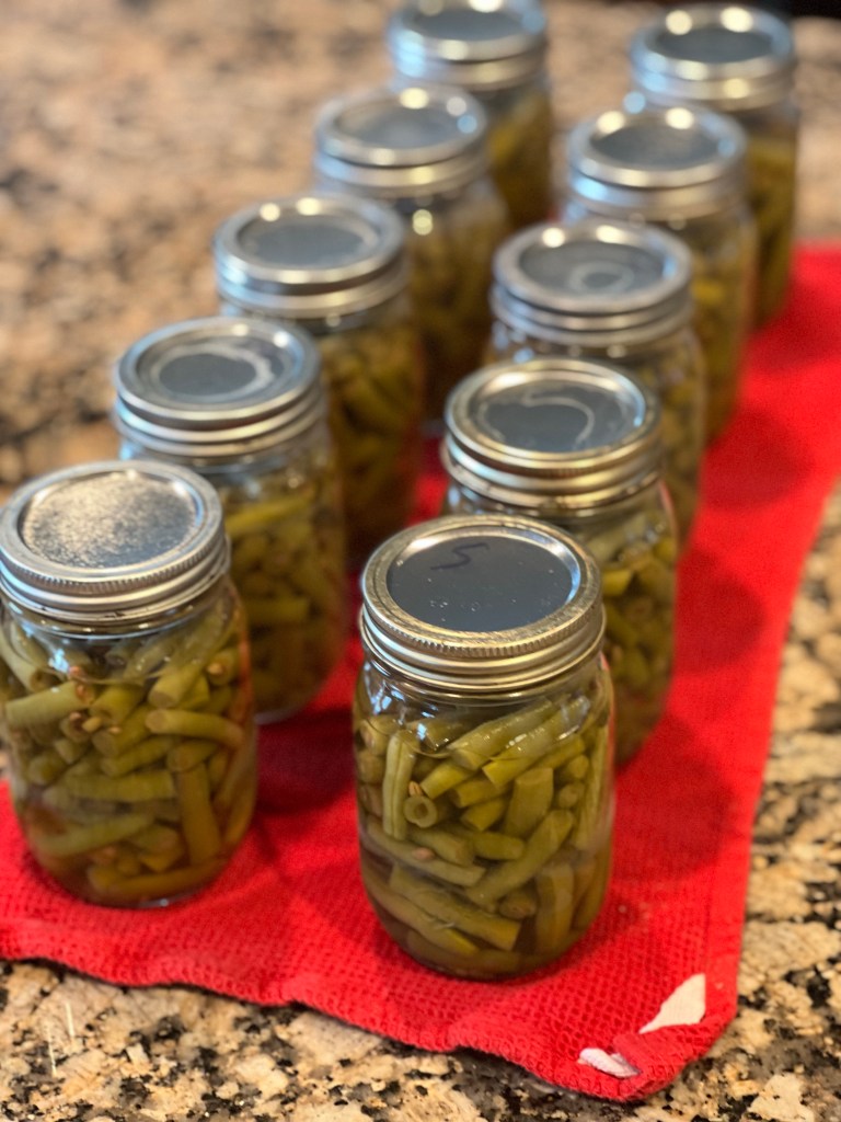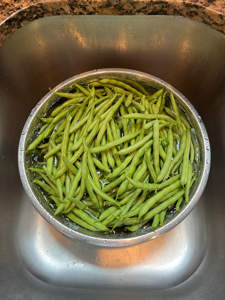 Although I very much enjoy the canning process, knowing how good it will taste later without all the extras in store-bought canned goods, the prep takes a while. Green beans are especially tedious. Every bean must have the ends cut off, after a thorough washing. Then, to fit as many in the jars, they need to be cut into two-ish inch pieces. Let’s just say it can take a while for the prep work.