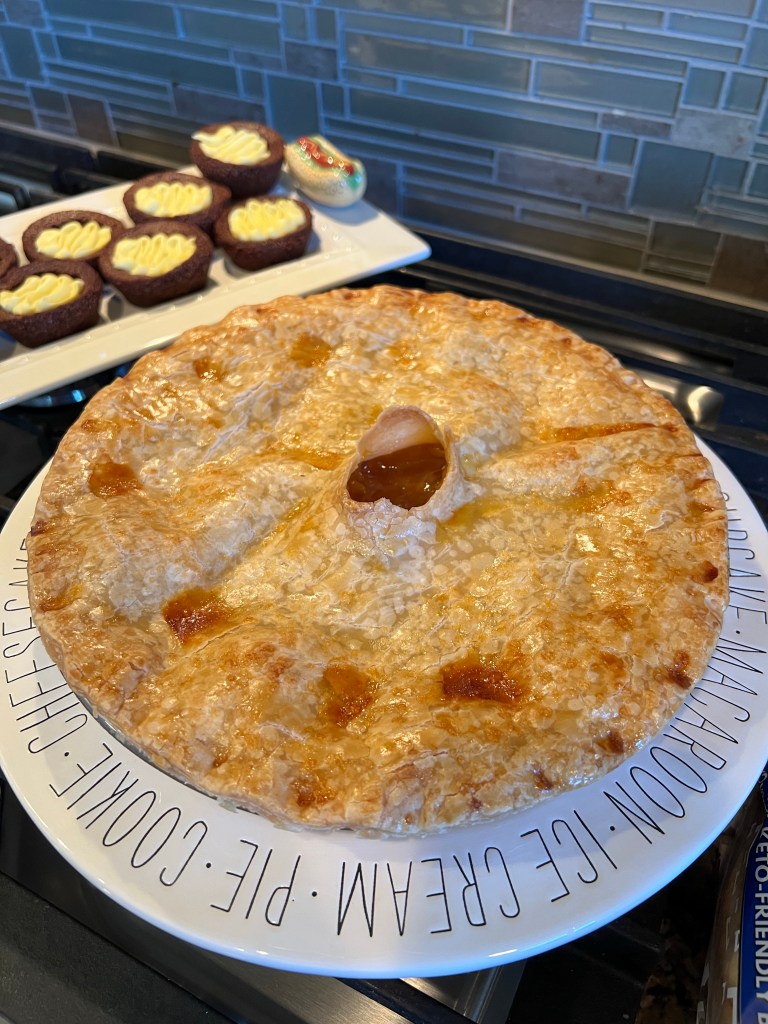 I put together a charcuterie board of cheese (thanks Carol the cheese lady) and veggies. And, of course, I had to make some desserts. At first it was just going to be a peach pie using filling from my canning and a banana cream pie. It just didn’t seem like it would be sufficient. So, I made some round brownie boats, filled with my homemade apple butter, topped with banana butter cream frosting.