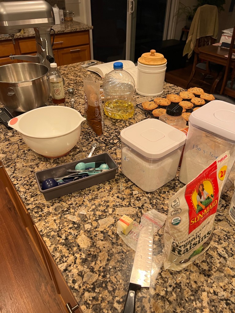 At first I only found craisins and wondered if I wanted to use them as a substitute. After a little more shifting of items in the pantry, I found the raisins. With the main ingredients on hand, I collected the rest and let the butter begin to soften. Oh, I should say I didn’t have a recipe for the oatmeal raisins in my recipe app. One-by-one I pulled out my cookbooks to see what I could find.