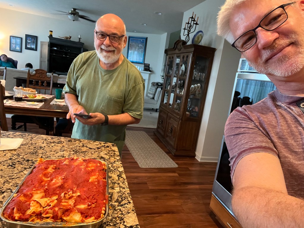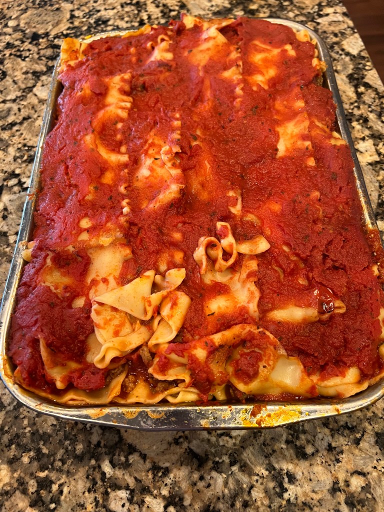 A little while later, after a short break, it was time to assemble the lasagna layers by first cooking the pasta noodles. The layers started with a little sauce on the bottom of the pan. Next came the noodles, the hamburger, thinly sliced sausage, ricotta cheese, Parmesan, and a light shake of salt and pepper. The layers went on one-by-one until we had done three, before topping it off with a final layer of noodles. We were actually making two at the same time, one for all of us, and one for a small gathering the two Papa’s were going to have.