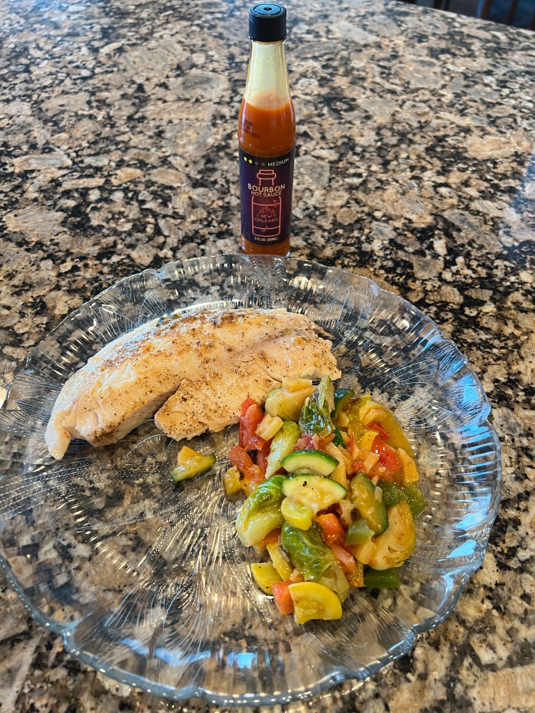 Fish was on the menu another evening. For that meal it was just Tilapia fillets and mixed vegetables. I sautéed the veggies in a mix of butter and EVO, plus a few spices. A bourbon hot sauce from the sampler pack was also added for a little extra oomph. For the fish, I made a paste to coat one side made of salt, pepper, and the bourbon hot sauce. It was then fried in the same pan after the veggies came out and set to the side. Had some for lunch the next day too.