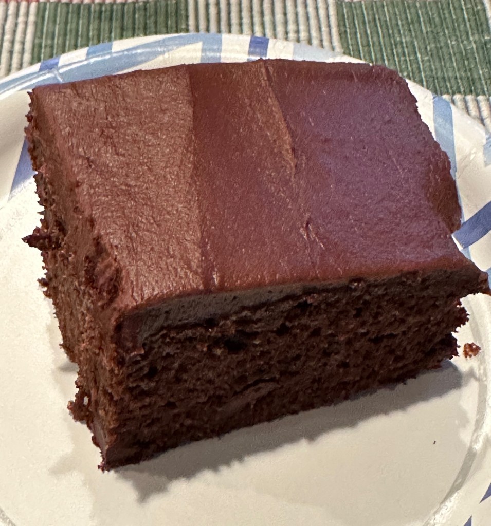 Although this was dessert for the last new recipe of the week, I made the zucchini chocolate cake with dark chocolate chips in the morning so it would be ready for Sunday dinner. Normally I am not a dark chocolate fan. But, after the blah of the pesto, I figured maybe I should stick to exactly what the recipes actually wants. With the chocolate buttercream icing, a cake that was just the right side of moistness and sweetness, the dark chocolate wasn’t too bad. The sweetness of the cake itself and the icing more than balanced the bitterness I often taste in darker chocolates. It was good enough that the Papas took an extra slice each home for later.