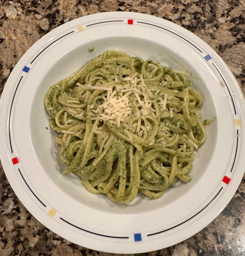 My second dish of the week was linguini with pesto sauce. This is one of those recipes that I just can’t seem to get to the taste I want. I’m not sure what that taste is yet, but I’ll know it when it happens. Pesto usually has some type of nut in it, although I’ve made one that was mainly parsley, no nuts. This recipe called for walnuts, but since we had New Mexico pecans in the house, I figured a nut was a nut. In using pecans as a substitute, they just didn’t seem to add anything. Even attempting to compensate with some spices and extra Parmesan, it just tasted kind of blah in the end. I may give it another try, but with the walnuts as originally stated.