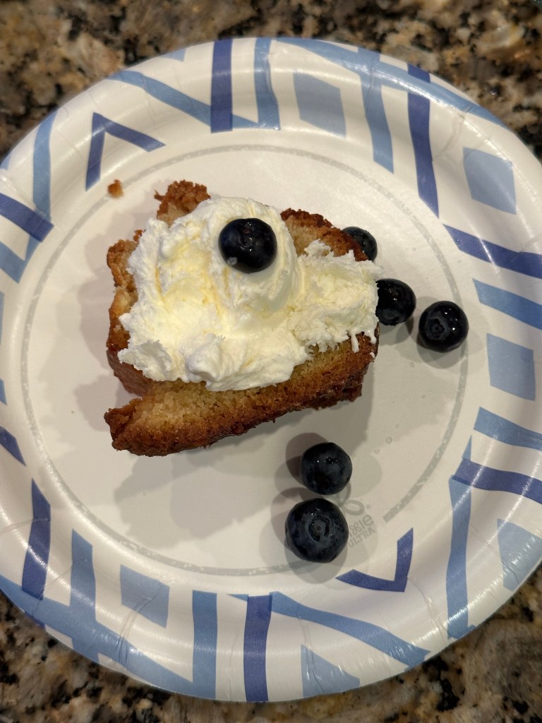 The soup was followed by a slice of brown sugar pound cake. If you’ve ever had a pound cake, it has gotten its name the honest way. It is a very dense cake, but just the right amount of sweetness. Having some homemade whipped cream and blueberries as a bonus helped a lot too with the sweet taste.
