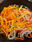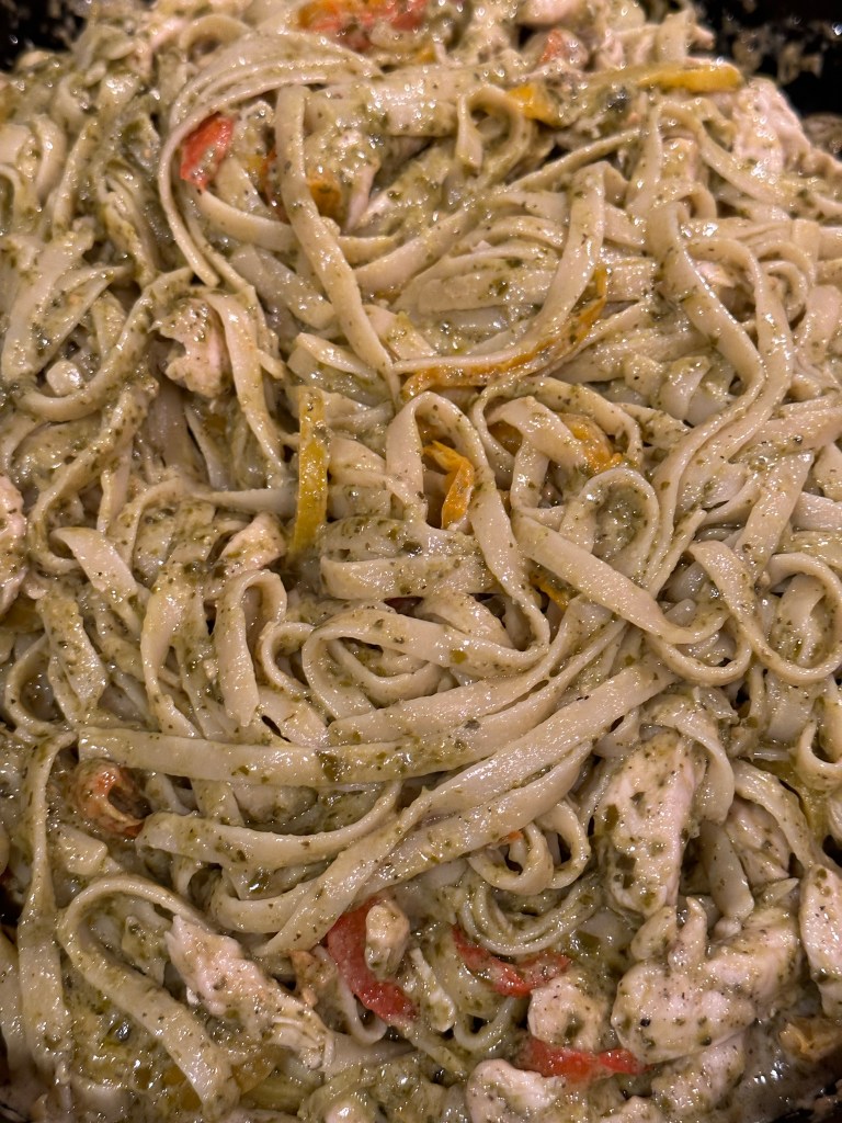 Earlier this week I posted a teaser picture of this next dish. I was just struck by the vibrancy of the multiple colored peppers and the onions as I started to put it all together. The end color wasn’t quite the same after adding some tomatoes, some Alfredo sauce, and a little pesto. Thank goodness the dulled down color didn’t affect the end taste.