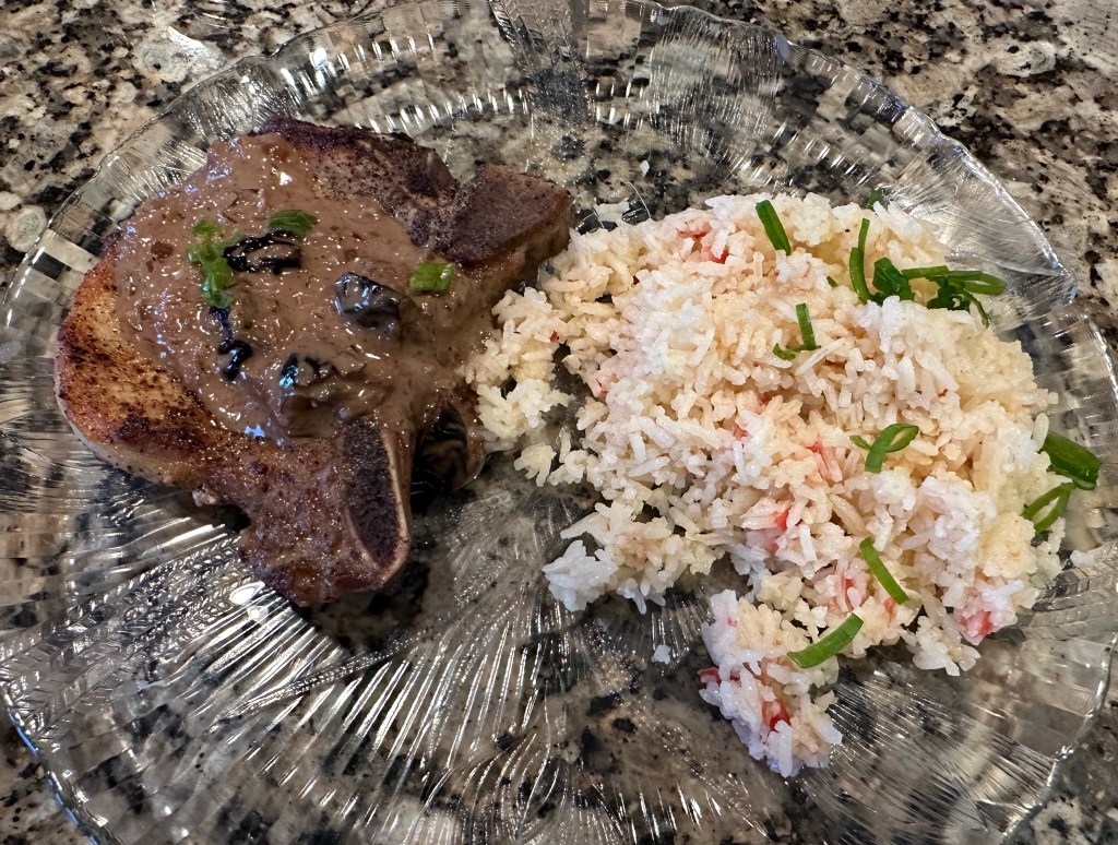 Last, but not least, is a recipe with prunes. Not an ingredient one sees a lot of when cooking. I can’t even remember the last time I had a prune. It was a key ingredient in the sauce reduction of which to smother the pork chop. The quartered prunes added a refreshing sweetness to it all. I added the garlic fried rice as a side. Fried rice is something I’ve wanted to try making for quite a while. So, when I saw a recipe with garlic, I just couldn’t pass it up. It went quite well with the pork chops. There was enough left over of both to make burritos for lunch, and used what remained of the rice to go with the orange chicken this evening. Gave me a duh moment that when I make rice next time, make extra to use throughout the week in other dishes.