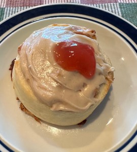 I’ll start with dessert. If it was good enough for George Burns to eat first, it’s good enough for the rest of us. This dessert I’ve been wanting to make for about a month. After making the strawberry jelly (in my Pampered Chef food processor), I couldn’t procrastinate trying to roll some dough. What I still struggle with in baking is rolling out dough to a certain size and shape. My rectangles are always a bit wonky and my rounds never are. I did come a little closer to an actual rectangle this time, and with the help of a tape measure, I got the dough to about where I needed it to be. Added the filling and did a less than ideal roll, but still workable. After adding the frosting, and serving warm, it was definitely peanut buttery and jelly-ish. Reminded me of a lunch sandwich, which isn’t bad at all.