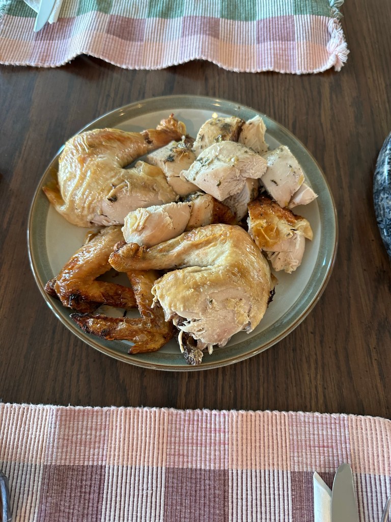 Nothing says Midwest like meat and potatoes. In this case chicken, potatoes, and a few other veggies. Throw in some lemon and thyme and you get, lemon-thyme roast chicken. What made this dish was the lemons. The recipe called for lemon juice, lemon zest, lemons in the chicken while roasting, and sliced lemons mixed with the potatoes and veggies. I had wondered if it might be too much lemon, but one bite in and it was immediately evident the lemon lifted the dish to a new level. Everyone made a similar comment during our Sunday family dinner (the peanut butter and jelly roll was the dessert).