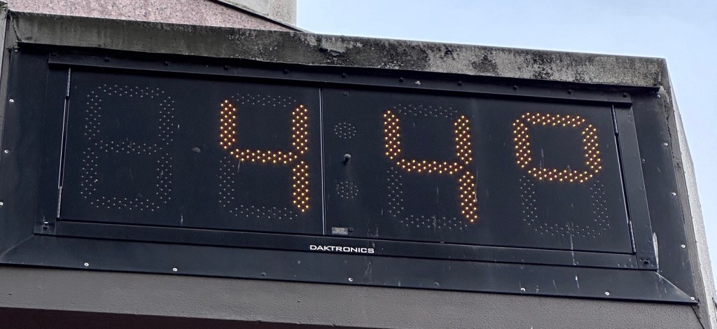 Every morning while walking to the light rail stop, this bank clock/temperature sign has said 44°. Regardless of how it feels or the weather that day, it has been steadfast.