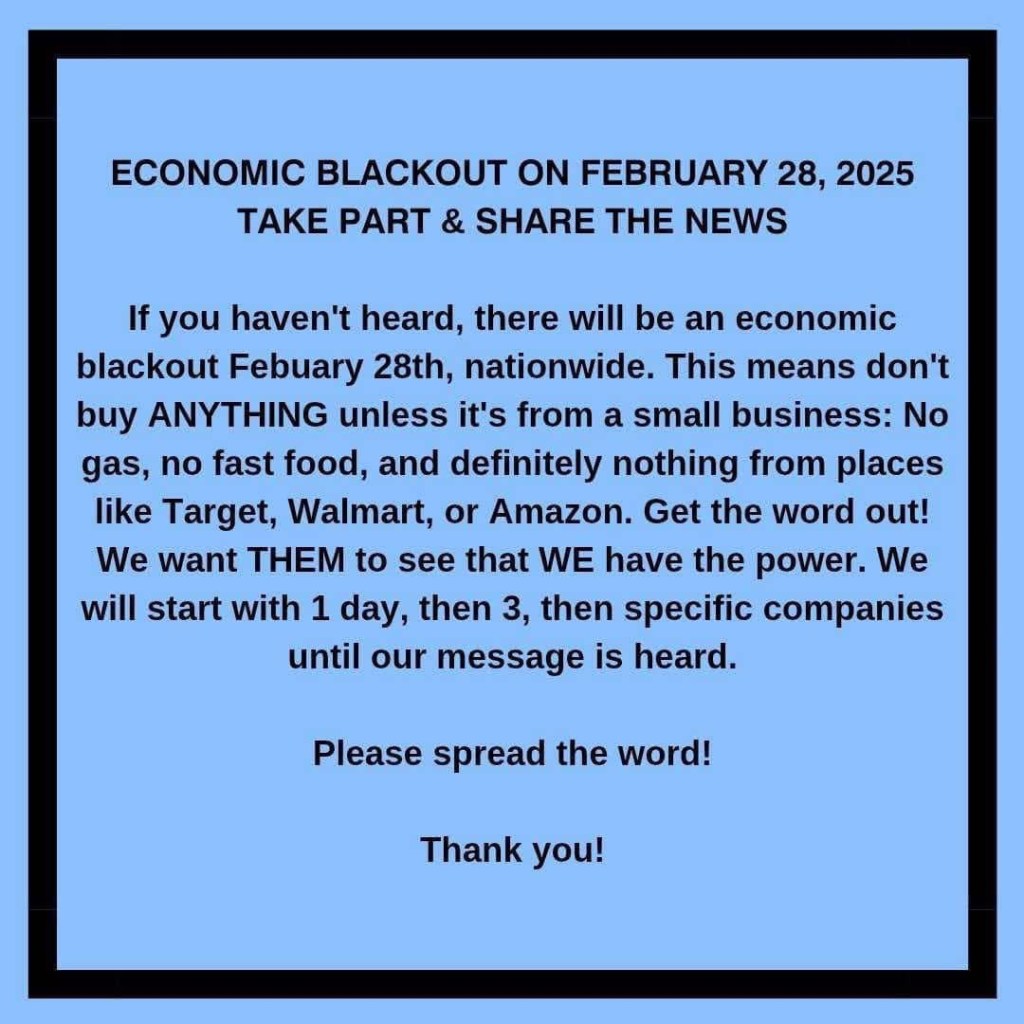 - Support the economic blackout on February 28. All day don’t buy from national chains or companies, such as Target, Amazon, or Walmart. If you must spend on that day, only buy from local small businesses to show the oligarchs we can survive without them, to hit them where it seems to hurt them the most, their pocketbooks. This time it will be for one day. If needed, the next will be for three, then more until big business realize the people are more important than the politicians to survive.